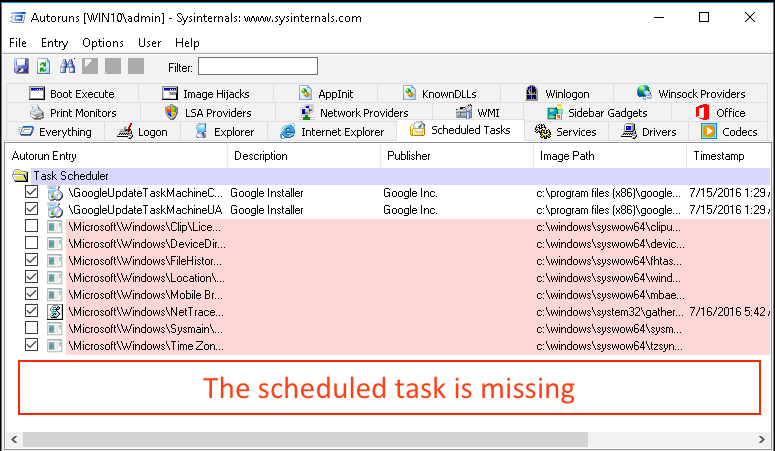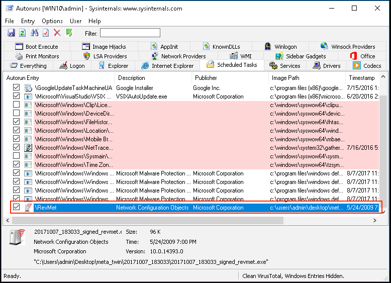 Using the modified binary, we created simple persistence mechanism using a scheduled task. AutoRuns can be used to display this type of Windows persistence. But… the modified binary is hidden by default. Take a look…
